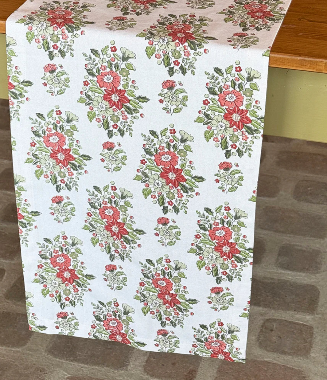 Handscreen printed runner. 13"X72". 100% Cotton. Machine wash in cold water. Low heat tumble dry.