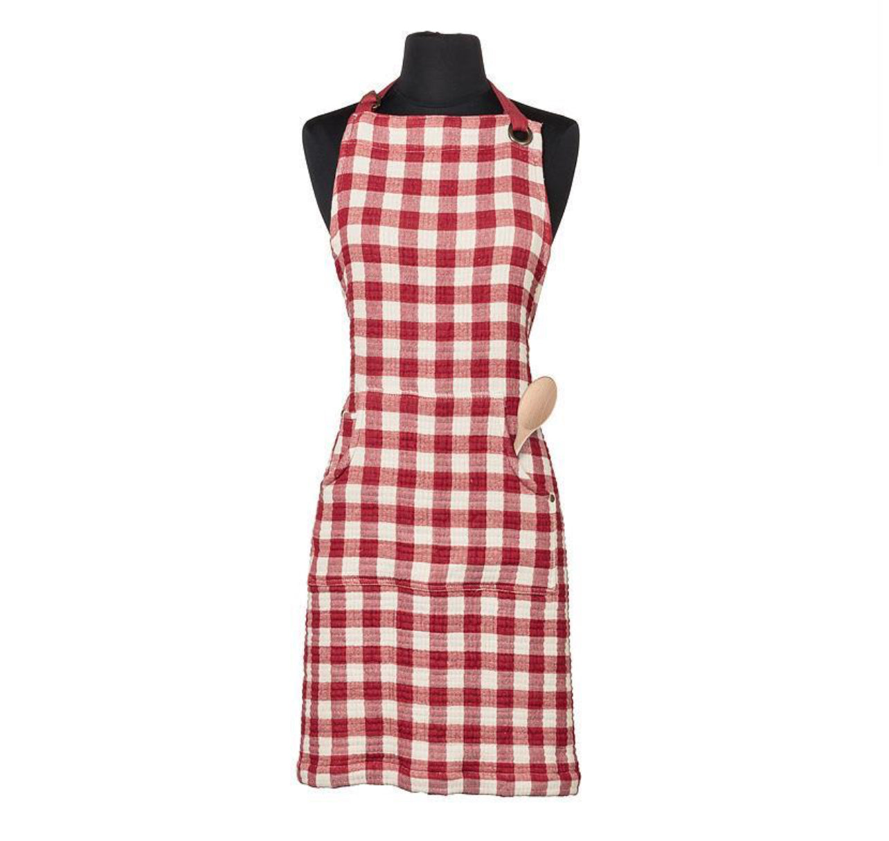 The apron features a pocket and the ties are reinforced with a sturdy metal grommet.